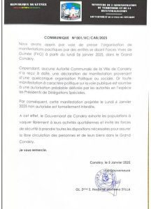 “Nous avons appris par voie de presse l’organisation de manifestations pacifiques par des entités se disant Forces Vives de Guinée (FVG) à partir du lundi 06 janvier 2025, dans le Grand Conakry.