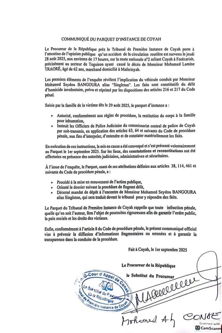 Cette décision fait suite à un accident de la circulation qui s’est produit, le jeudi 28 août 2025, dans la localité de Toguiron, entre Forécariah et Coyah.