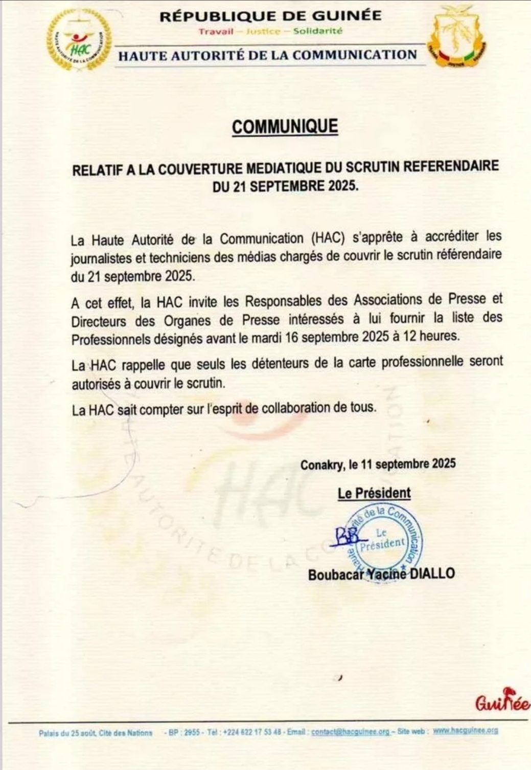 À quelques jours de la tenue du scrutin référendaire prévu le 21 septembre 2025, la Haute Autorité de la Communication (HAC), à travers un communiqué a invité les associations et organes de presse désireux de couvrir l’événement à déposer la liste de leurs journalistes en vue de leur accréditation.