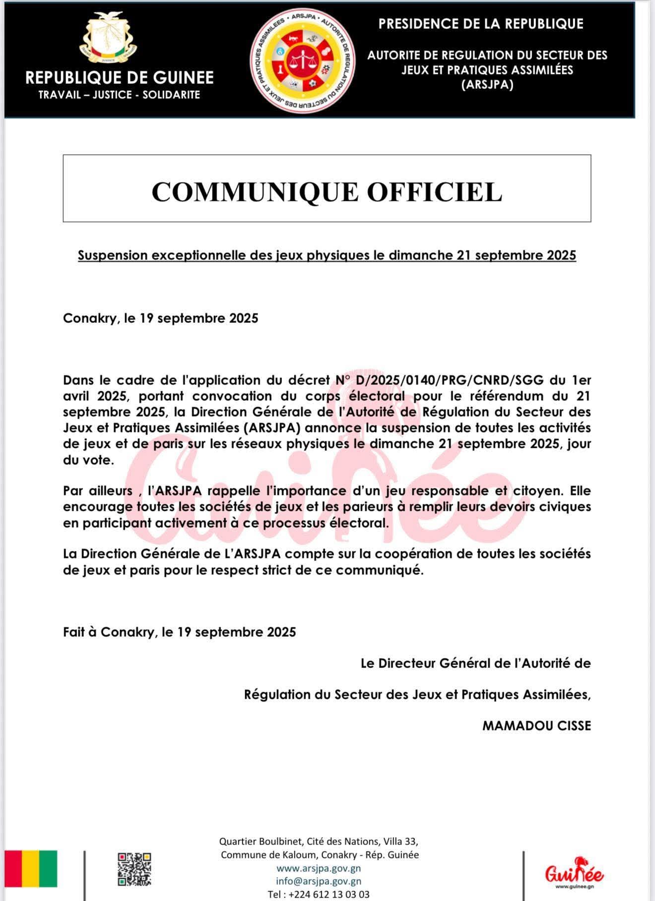 A travers un communiqué dont la copie est parvenue samedi 20 septembre à notre rédaction, l’Autorité de Régulation du Secteur des jeux et Pratiques Assimilées ( ARSJPA) annonce la suspension exceptionnelle  des jeux physique ce dimanche en raison de la tenue du referendum constitutionnel sur l’étendue du territoire national. Elle encourage toutes les sociétés de jeux et les parieurs à remplir leur devoir civique  en participant activement à ce processus électoral.