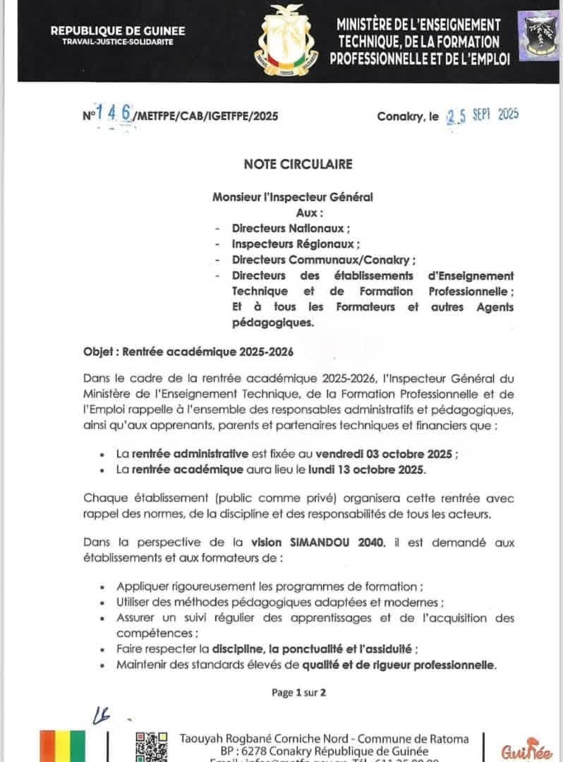 Dans une note circulaire publiée ce lundi 06, le ministère de l’enseignement technique, de la formation professionnelle et de l’emploi a informé l’administration, les apprenants et les parents de la date de la rentrée administrative et celle académique.